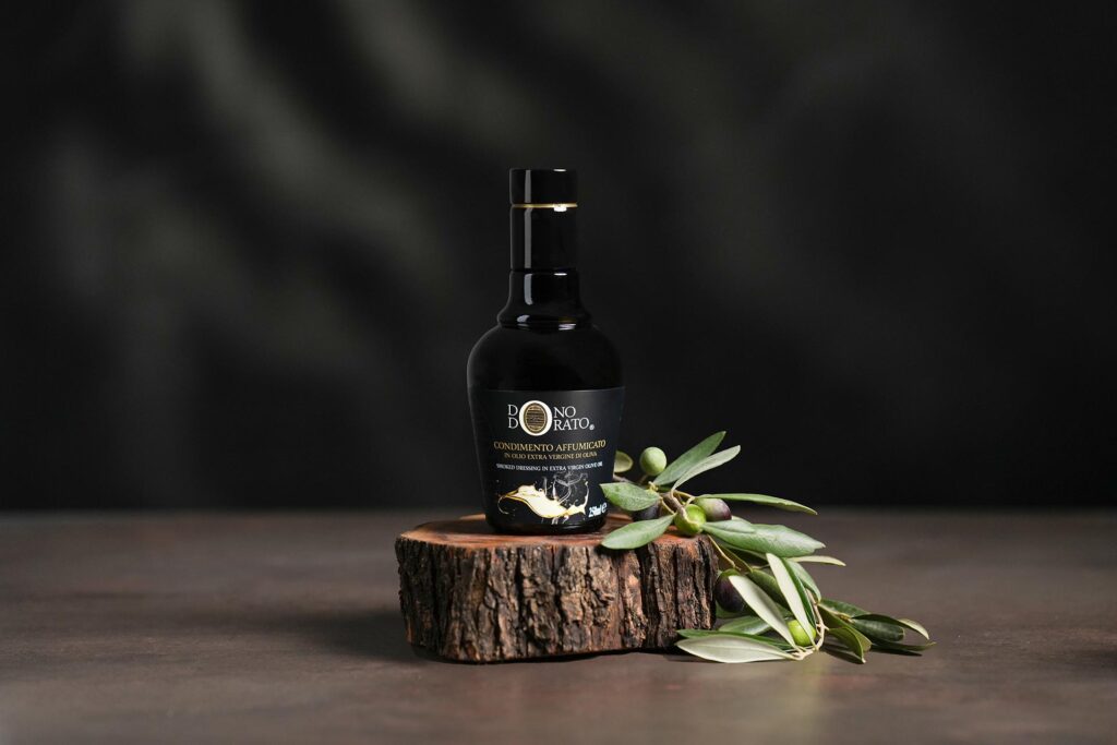Smoked condiment in extra virgin olive oil “Dono Dorato” in a 250 ml Morandi bottle.